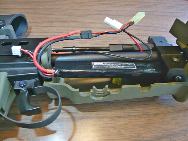 ハンドガードを開けてバッテリ―を収めます。コネクターはタミヤミニタイプ、ヒューズはミニ平型のものが付いています。
