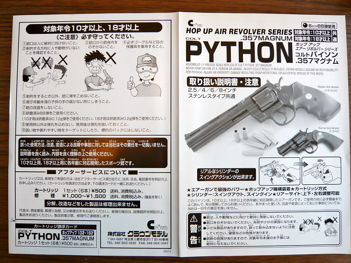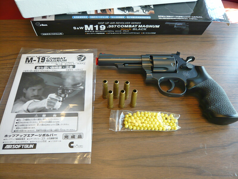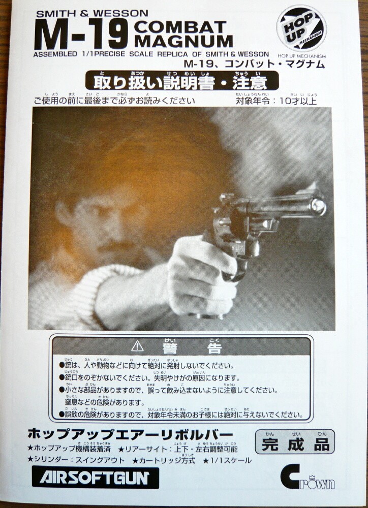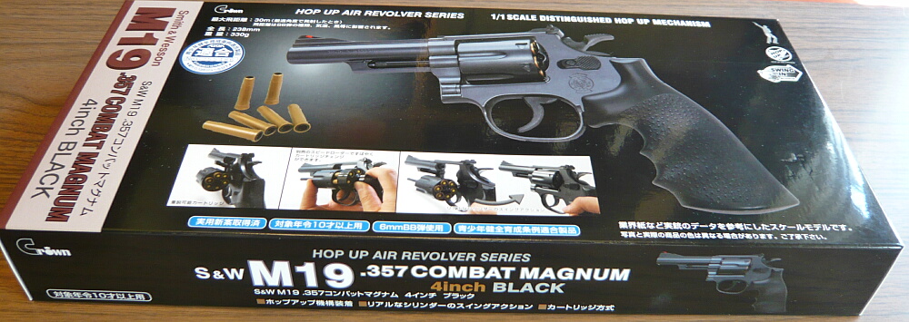 クラウンのリボルバーはエア式が10歳以上用と18歳以上用、ガス式の18歳以上用があります。ラインナップとしては定番のパイソンのほか、S&WのM29/629、M19、M586/686。何故かM19のシルバーモデルであるM66はありません。とりあえず買ったことが無いM19、気軽にエア式の10歳以上用をチョイス。バレル長はやっぱりルパン三世のルパンの相棒である次元の愛銃4インチ。