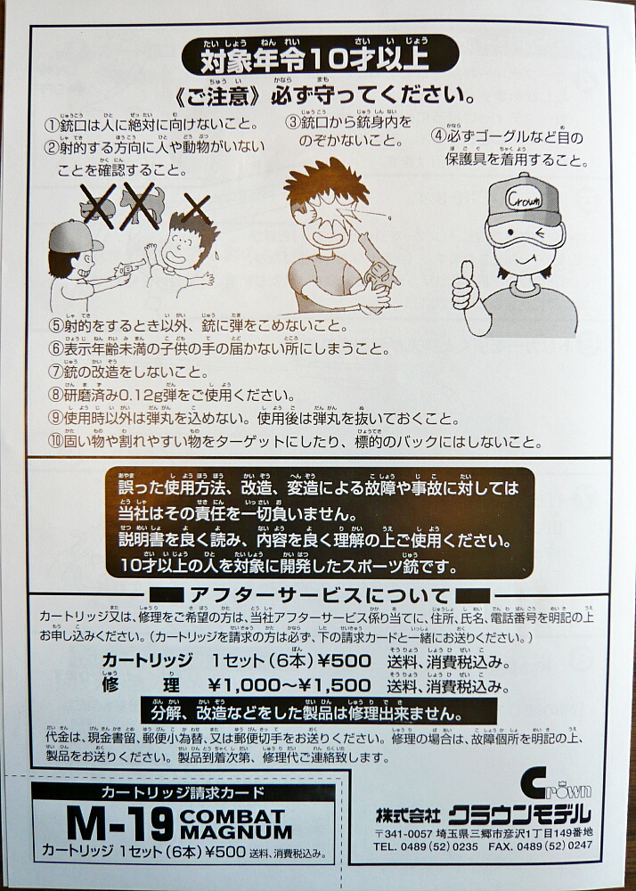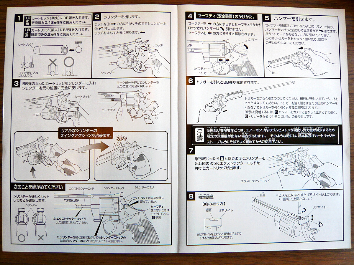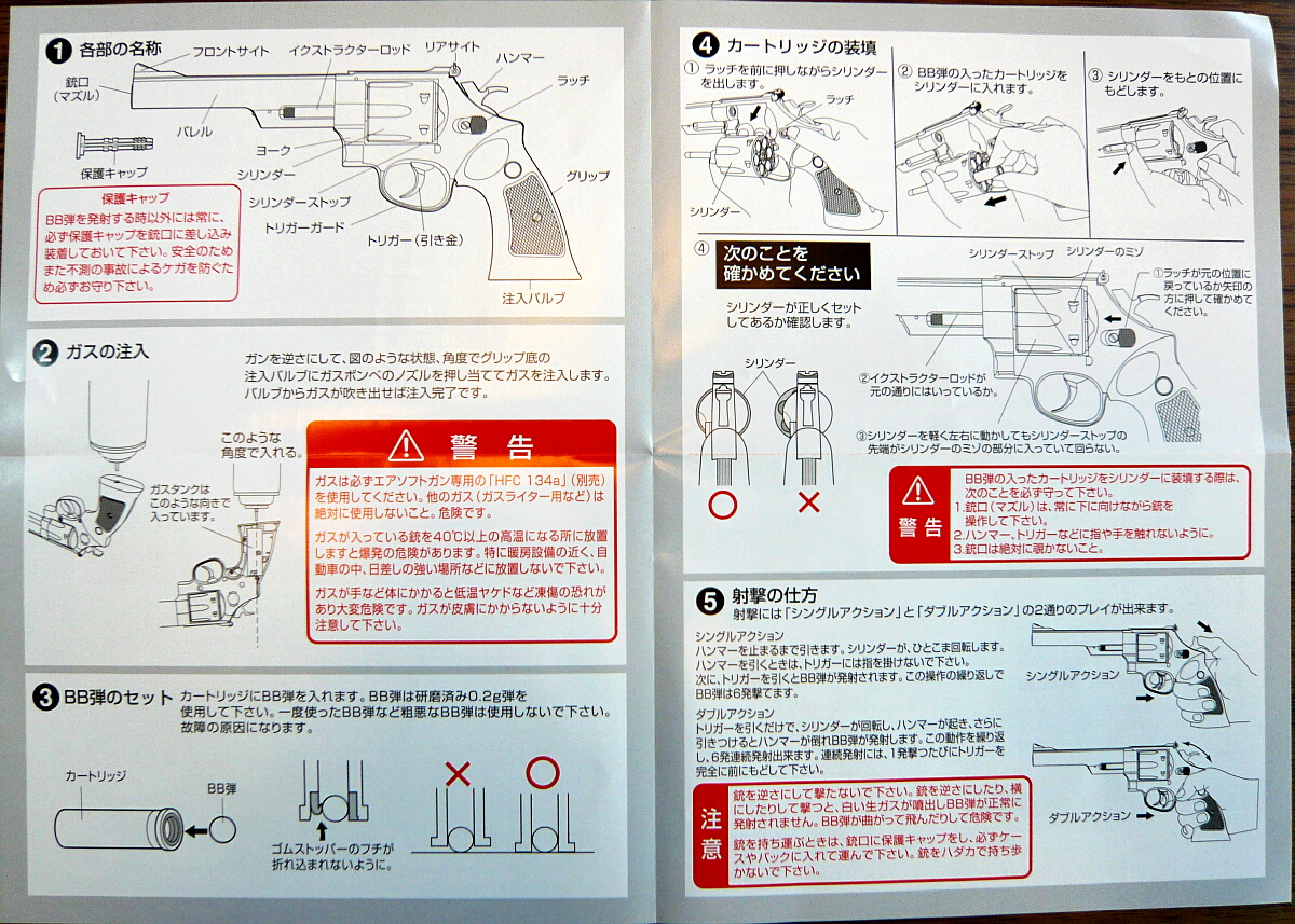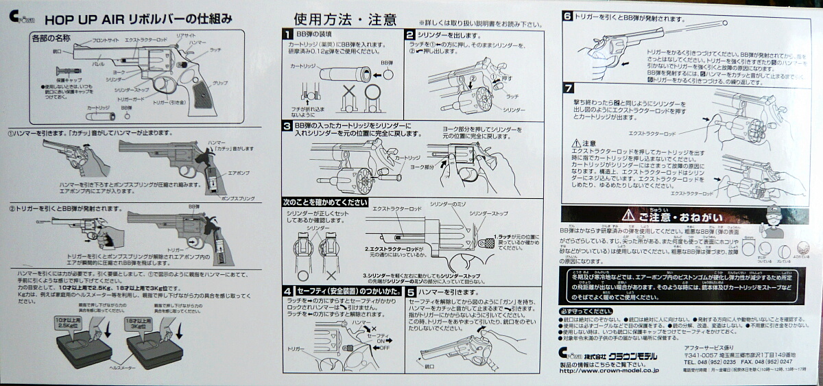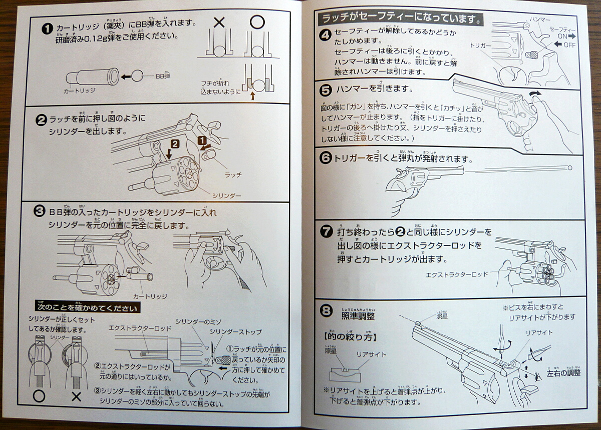 説明書。ガスリボルバーとしては標準的な構造なので使い方も大体マルシンあたりの常識が身に付いていれば同じように扱えますが、あちらも個々により特有のクセがあるようにこちらもちゃんと目を通しておきましょう。
