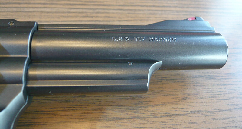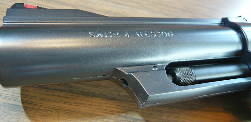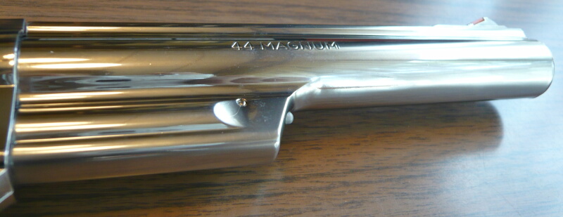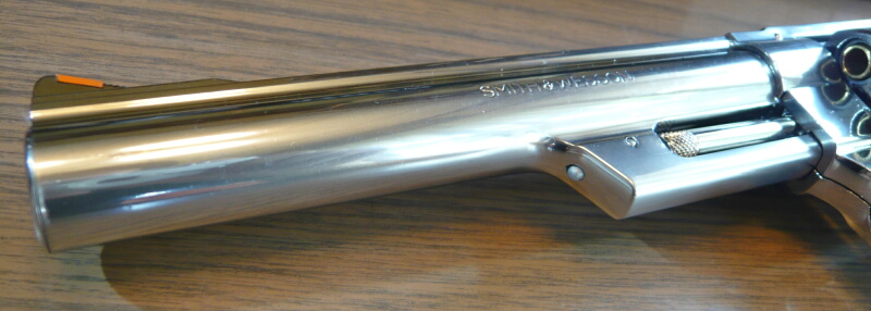 バレル左側。M29同様の特徴的なエジェクターロッド・シュラウドがバレル下にあります。刻印は浅めで、いかにも後から掘った感じを再現しています。