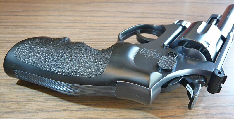 グリップ後面にはフレーム後面が露出しています。昔マルイの造るモデルガンシリーズのM29の4インチと6インチを持っていて6インチの方にこれと同様の黒いグリップが付属していたのですが、印象としては当時と同じく「ぶっとい」と感じます。でもぶっといけど丸いので握りやすい方でしょうか。前後方向は太いというよりもトリガーが遠い方が気になりますが、左右はダブルカ―ラムのオートくらいに感じます。