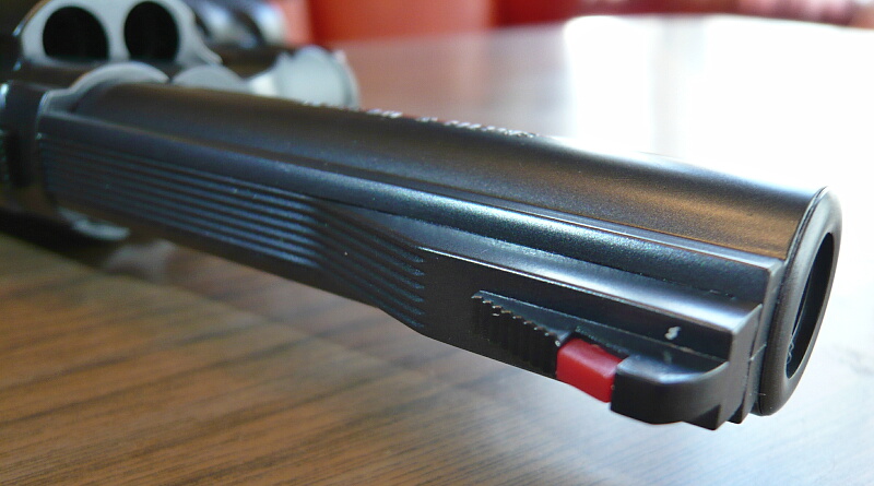 フロントサイトは一緒にメッキされているのでちょっと見づらいデメリットがありますが、赤いインサートが入っており、何も無いよりは余程サイティングの助けになります。