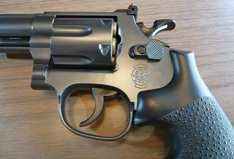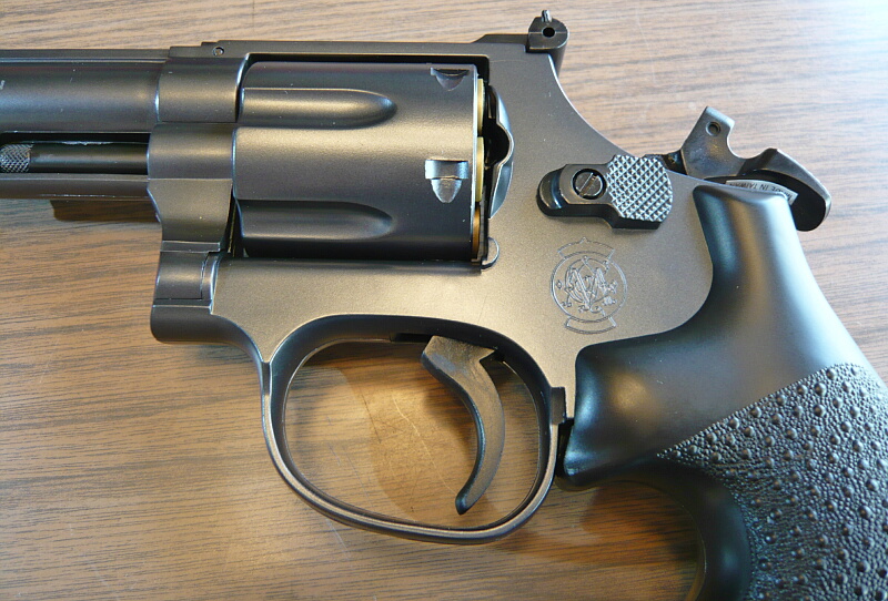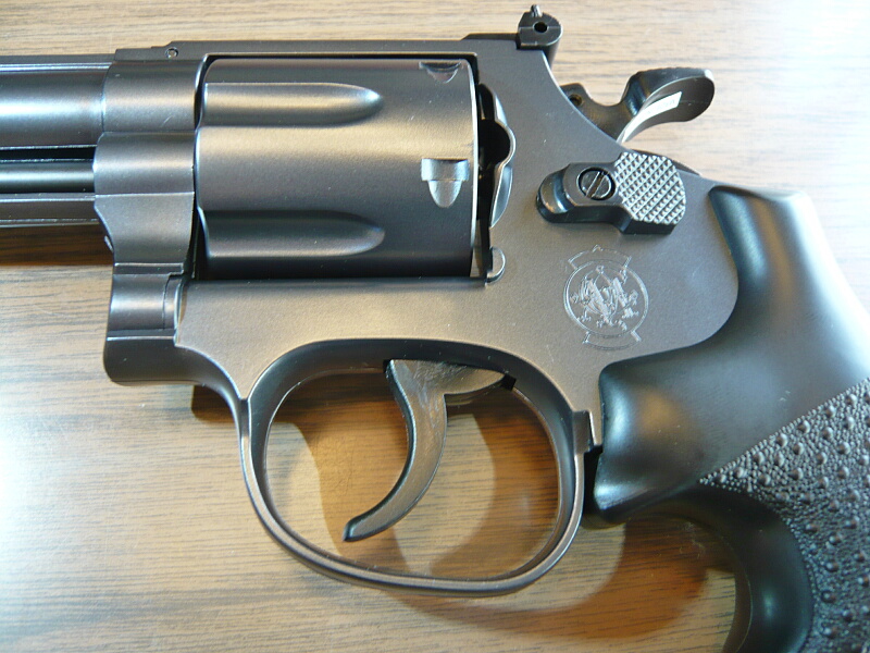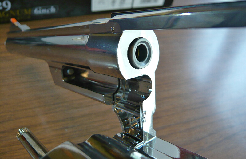 6インチの長いバレルは.44口径(11.2mm)のバレル内径を内に持つため太いですが、バレル下にバレルシュラウドを持たず、エジェクターロッドを覆う分だけのため案外スマートに感じます。M586/686のようにバレル下のシュラウドが銃口まで伸びている「M629クラシック」も迫力がありますが、こちらとて負けていません。