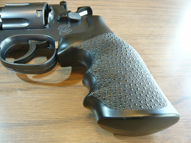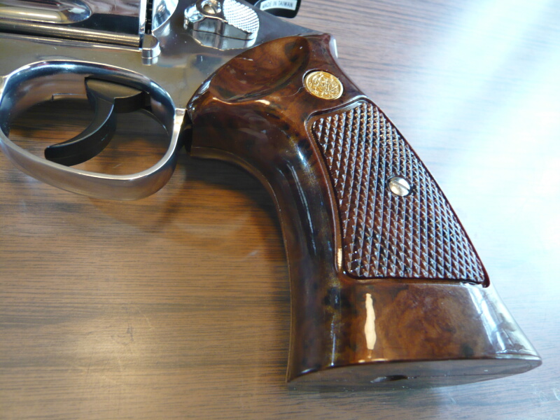 グリップは・・・何ていうんだろこのタイプ。M29の標準的なグリップです。「ダーティハリータイプ」というやつは側面のチェッカリングがもう少し前後に広がってるタイプのようです。樹脂製で木目を模した模様と特殊ラミネート加工によるテカテカ仕上げになっています。