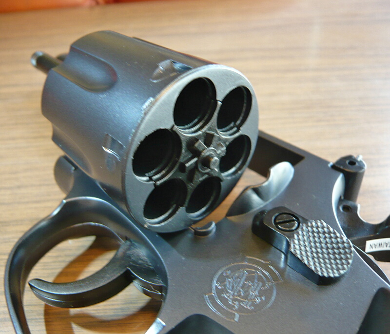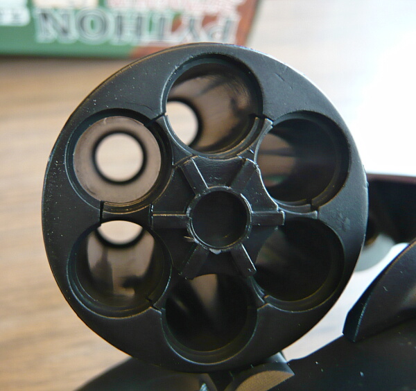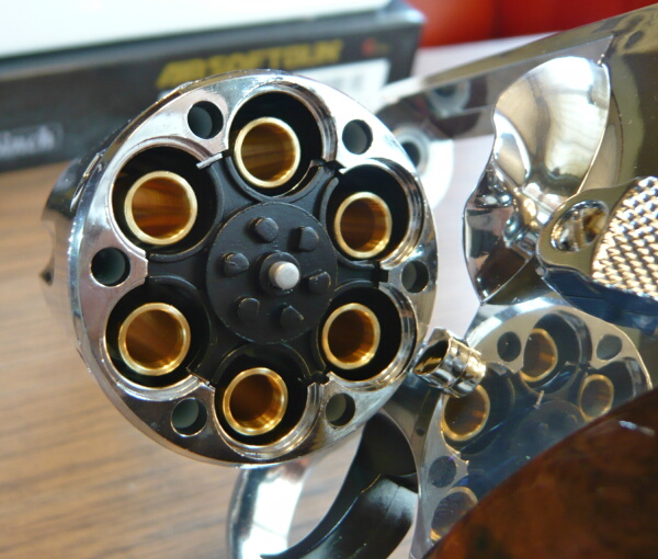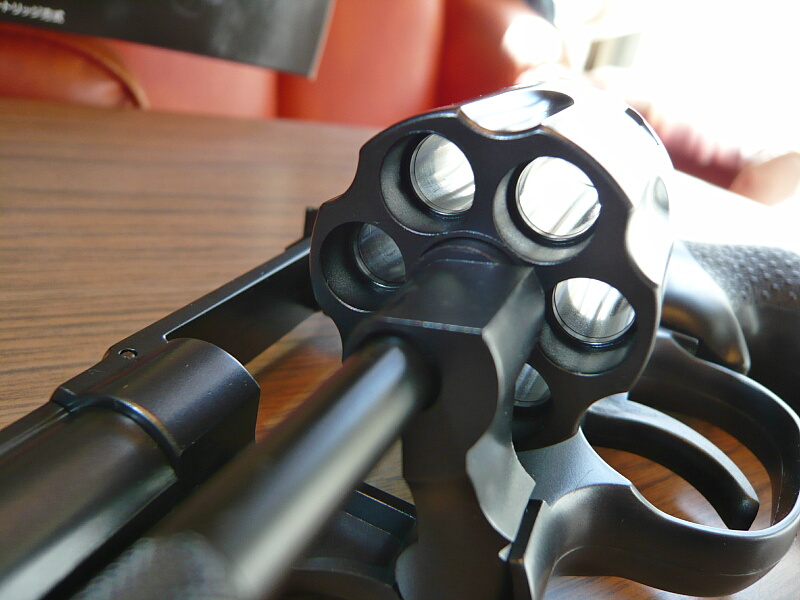 シリンダー穴は独立していて繋がってはいません。エジェクターやエジェクターロッドは金属製のように見えます。写真を撮り忘れましたがエジェクターロッドを前から押すと可動範囲は1cmほどで、M19よりも大きく動くように感じます。