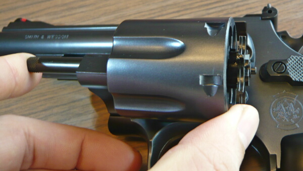 フレーム左のサムピースを押しながらシリンダーを右から押してスイングアウト。シリンダーの穴に筒が入っていてちょっと独特です。