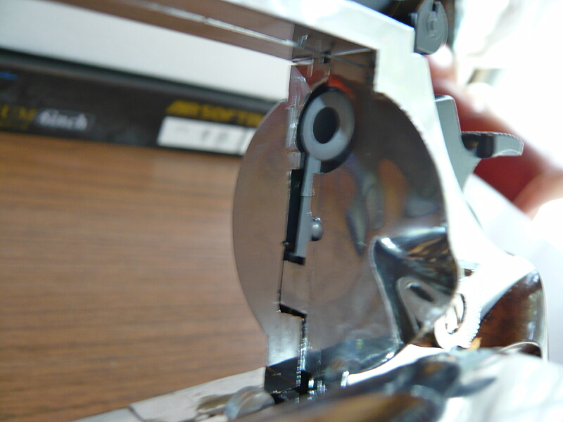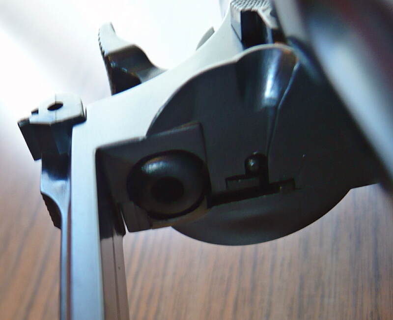 シリンダー前面と接するバレル側。フォーシングコーンがあります。M19ではマルシンのリボルバーのようにフォーシングコーンがスプリングで前後に可動するようになっていましたが、こちらは固定されています。そのためシリンダー前面の穴とは噛み合っておらず、常に僅かな隙間がある状態になっています。トリガーを引き切った時にエア噴出口が可動してカートを前方へ押した時のみフォーシングコーンにカート前面が押し付けられてエア漏れを防ぐようになっています。そのためハンマーをコッキングせずにトリガーを引くとシリンダーだけが回転するのですが、M19では引っ掛かりがちだったのに対しこちらは非常に軽いトリガープルで軽やかにシリンダーが回転します。