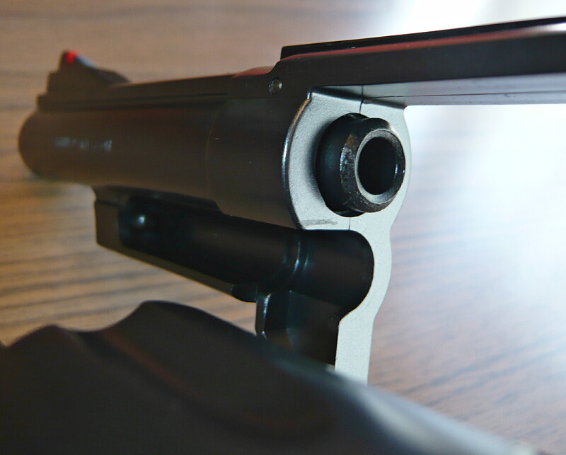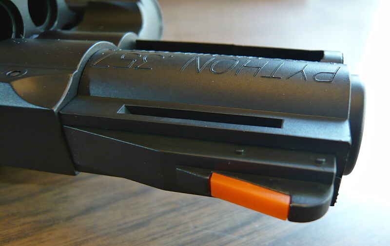 バレル左面。パイソンの特徴であるバレル上のクーリングチャンネルとされる穴は2.5インチでは1個。バレル下のシュラウドはちょうどエジェクターロッドを包むのに最低限の長さ。バレルは短い事もあるのですが付け根は思いのほかしっかりしていて6インチくらいあっても強度的な不安は無いのかもしれません。(弱いイメージをもっているのはマルイのエアリボが4インチでもややグラグラしているのと、マルイの造るモデルガンシリーズの6インチが振り回すのに躊躇するほどフレーム前端の強度が怪しかったのがあります…)