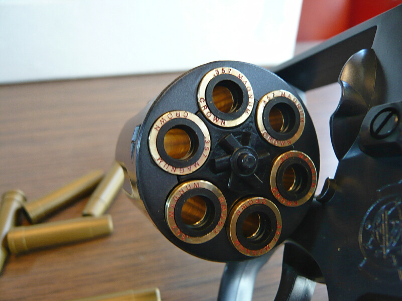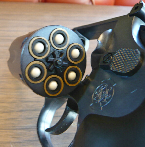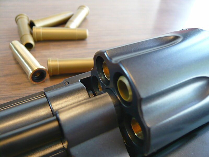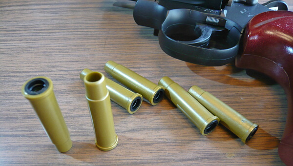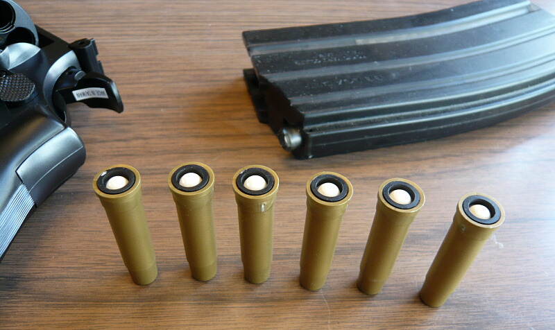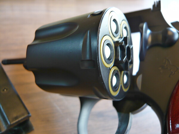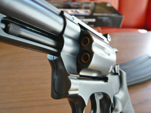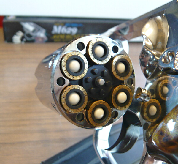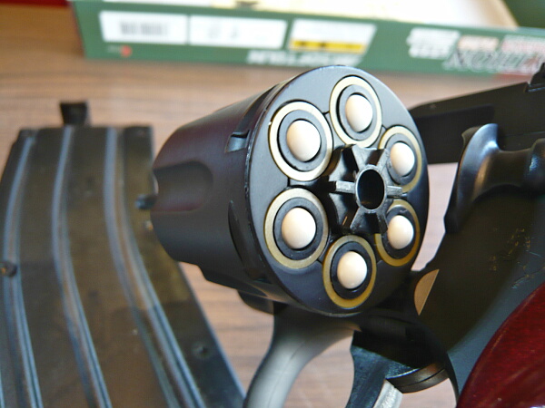 BB弾を込めて撃ってみると、「ブッシュ・・・」という音がしてハンマーがゆっくり倒れ、弾は発射されませんでした。しかもその後スイングアウトしようとすると引っ掛かって出てこない・・・色々ガチャガチャやってるうちにどうにかスイングアウトする有様なので、適応外のカートは絶対に使用しない方が良いでしょう。安いとはいえ、こんなつまらん事で壊しても面白くありませんし。
