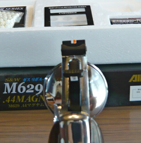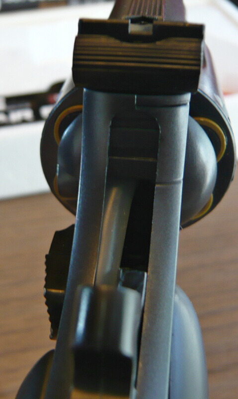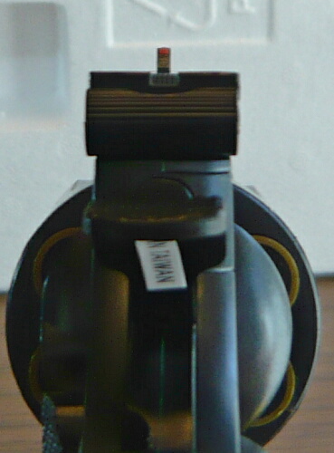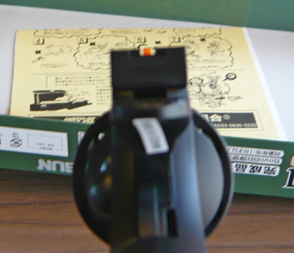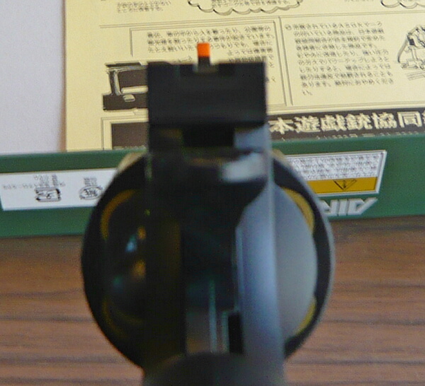 リボルバーの御多分にもれず、前後サイトの位置関係は上写真くらいで狙点に飛ぶ印象。ただしこの銃はリヤサイトを2mmほど上に上げられる余地があるのでもう少しフロントサイトを低めのサイトピクチャーに調整できるでしょうか。グルーピングはあまり厳密には調べていませんが、やや左に寄りがちなところがありました。トリガープルが重いのでそこが少し影響したかもしれません。