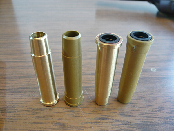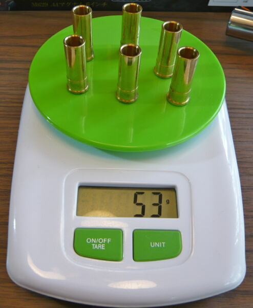 カートは真鍮製ですが弾頭部が無い独特な形状。.44マグナムというにはちょっと小さくてカートの外径は10.3mm、一段太くなっている部分の外周10.8mm、リム部の外周11.8mm、内径8mm、カート全長29mm。サイズ的には9mm×29R=.38spに近いサイズ。