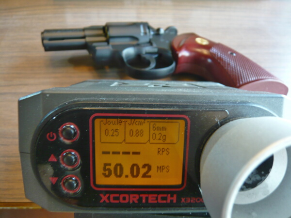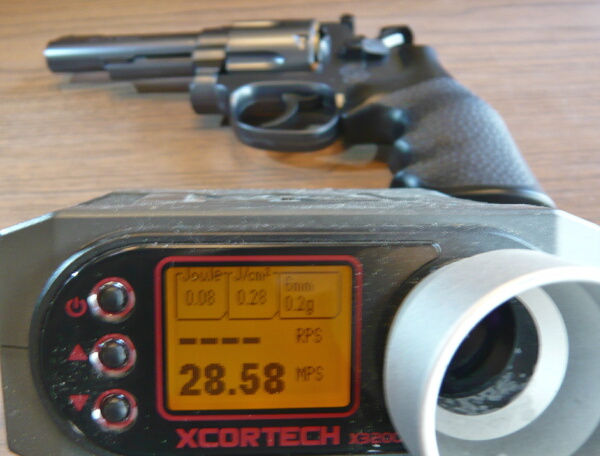初速をチェック。大体27~30m/sほどで、稀に16くらいのが出る事もあります。カート式リボルバーでは仕方ないのですが、狙点に対し左右はあまりブレませんが上下のブレが大きめでHOPの掛かりがマチマチな印象。