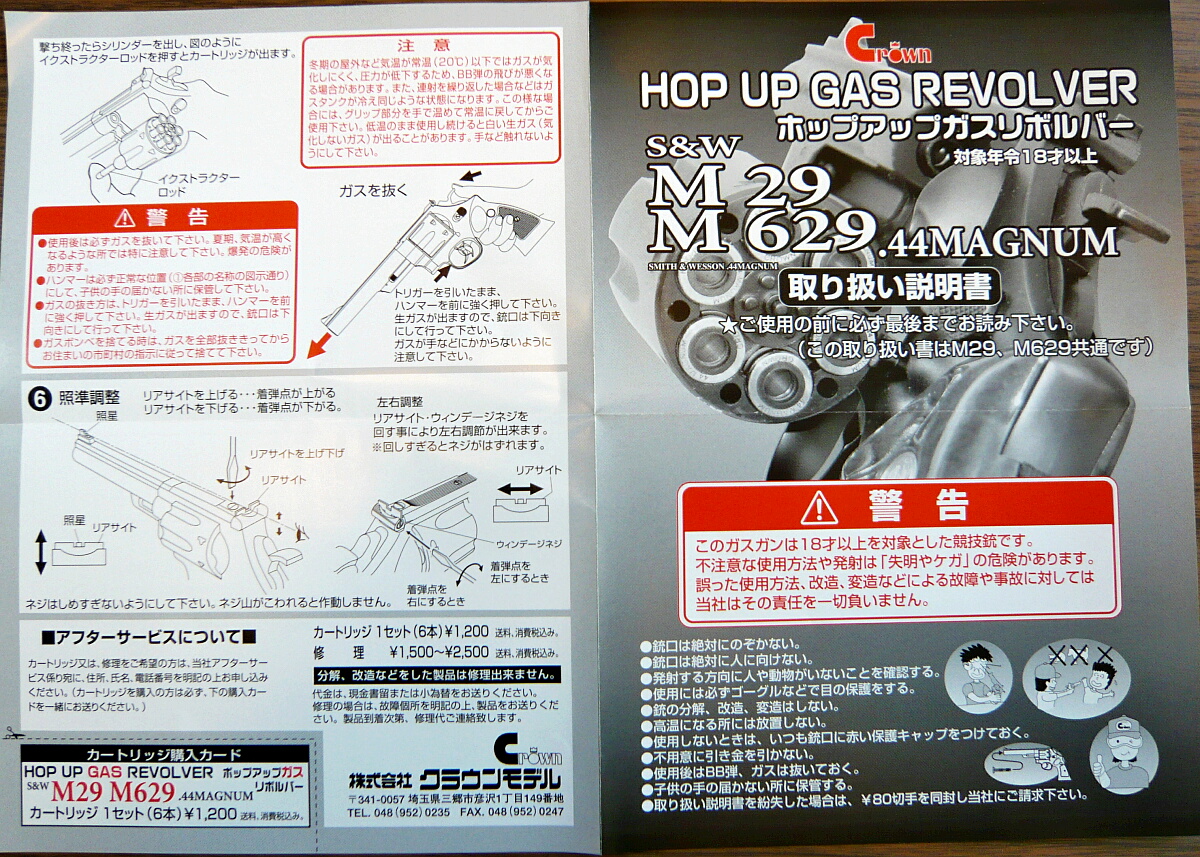クラウンのガスリボルバーは触った事がなく、やはり「クラウンだし・・・」という先入観でタカをくくっていたのですが、他所のレビュー動画などを見ると単にエア式をガスガン化したようなものではなく全然見た目も違うし、その割に値段が7千円程度とお安いので買ってみる事にしました。ラインナップはエア式同様にパイソン、M29/629、M19、M586/686。パイソンは定番すぎてパスするとして、M19はエア式を注文していたのでM29か。M686はマルシンのもってるし。でも黒いM29か銀色なM629か、という選択ではギラギラメッキ仕上げについ目がいってしまったのでM629。バレル長は4インチは扱いやすそうではあるもののM29には少し寸詰まり。8インチは長すぎるので6インチ。