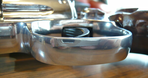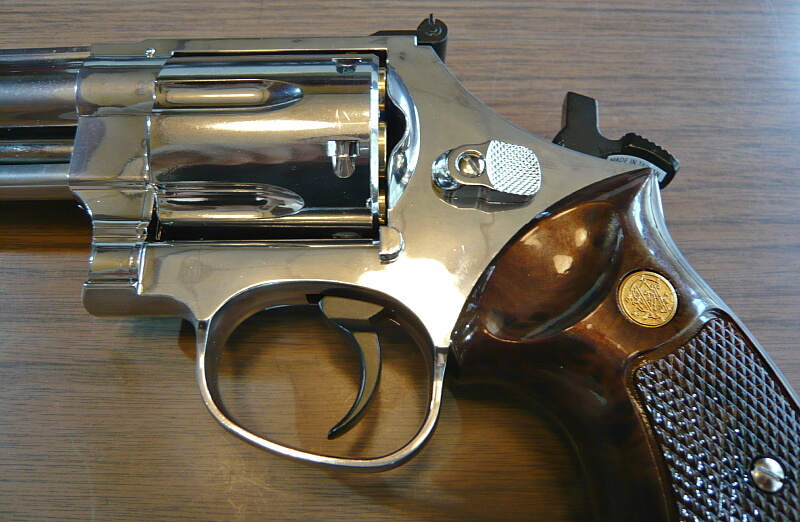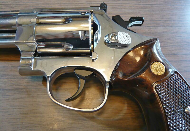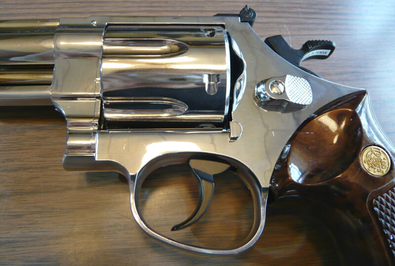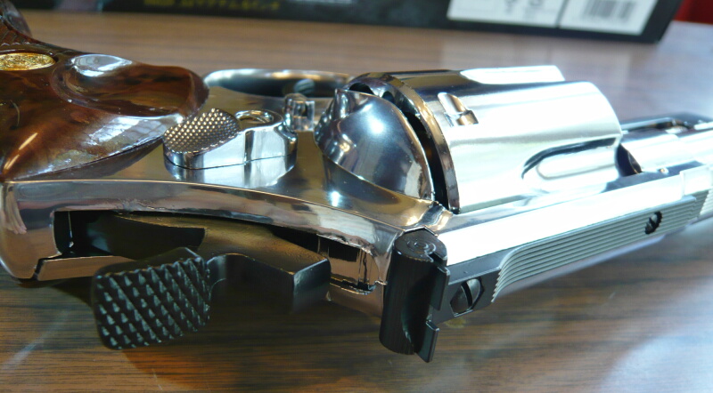 銃本体左右。何と言っても目をひくのはこのテラッテラに輝く光沢メッキ仕上げ。油断してると顔が映りこんで写真に入ってしまうので撮影にも気を遣います。また照明の光も強く映りこむのでカメラの補正で写真が暗くなりがち。