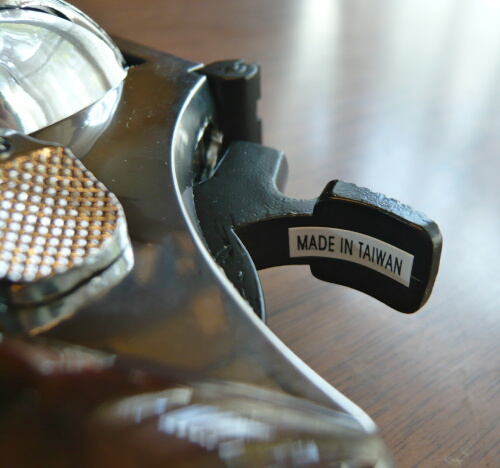 ハンマーの裏にはMADE IN TAIWANのシールが貼られています。ハンマースパー(ハンマーを起こす時に親指を掛ける部分)は引きやすいようにかかなり大型化されています。