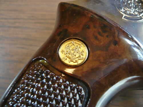 グリップ上部左右に金色のメダリオンがはめ込まれています。グリップ形状は単純ですが握り心地は断面が丸い事もあってかかなりしっくりきます。ただし親指の付け根や手のひらの触れる位置をグリップ後面の中ほどがいいのか起こしたハンマーの頭に触れるくらい上の方がいいのか少し迷うところがあり、実銃の場合はリコイル発生時に手のひらでグリップが縦に滑りそうな感じはあります。