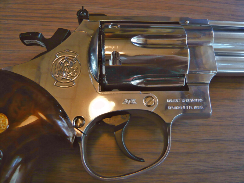 フレーム部。M29は.44マグナム弾を発射するために大型のNフレームを熱処理により強化した専用フレームを持つマグナム・リボルバーとして1955年に登場しました。登場後は割とマイナーに甘んじていましたが、1971年の映画「ダーティ・ハリー」に登場し、超強力なリボルバー拳銃として一躍有名となります。M629は材質をステンレススチールとしてメンテナンス性を向上させ、外観的にも銀色に輝く美しいモデルです。