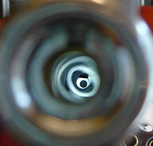銃口からインナーバレル内をのぞいたところ。フォーシングコーンの後端から中に1cmほどの上面にHOP突起があります。
