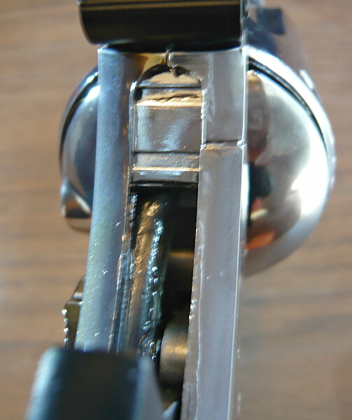 ハンマーが倒れた状態。ハンマーは少し浮いた状態がデフォルトで、その先にガスタンクのバルブを押す分のストロークがあります。この位置から先へはトリガーを引き切った時のみ移動できるようになっているのでトリガーを引いていない状態でハンマーを後ろから押してもガスが噴出したりはしません。