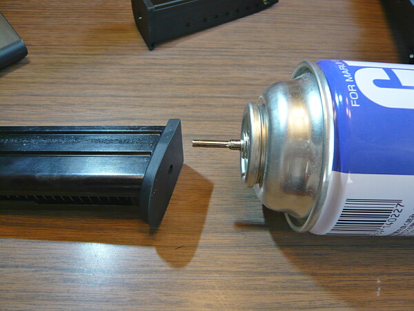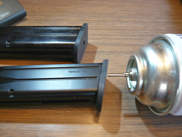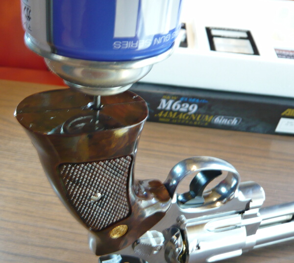それでは発射の準備を。グリップ底部のガス注入口からガスを注入します。缶を傾けたりだとか、ハンマーを起こしてからとか、そういう注意事項は特にありません。