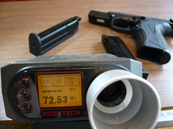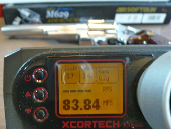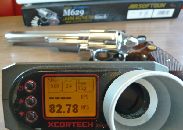 初速をチェック。気温は27℃、弾は0.2g。シングルアクションでは80m/s台前半ほど。発射音(ブツンンという感じ)はおとなしいですが弾はかなり勢いがあります。