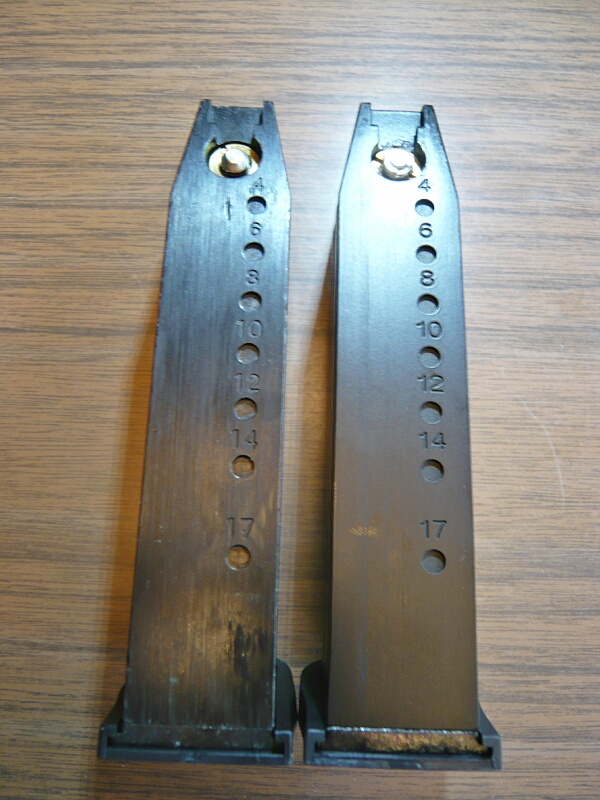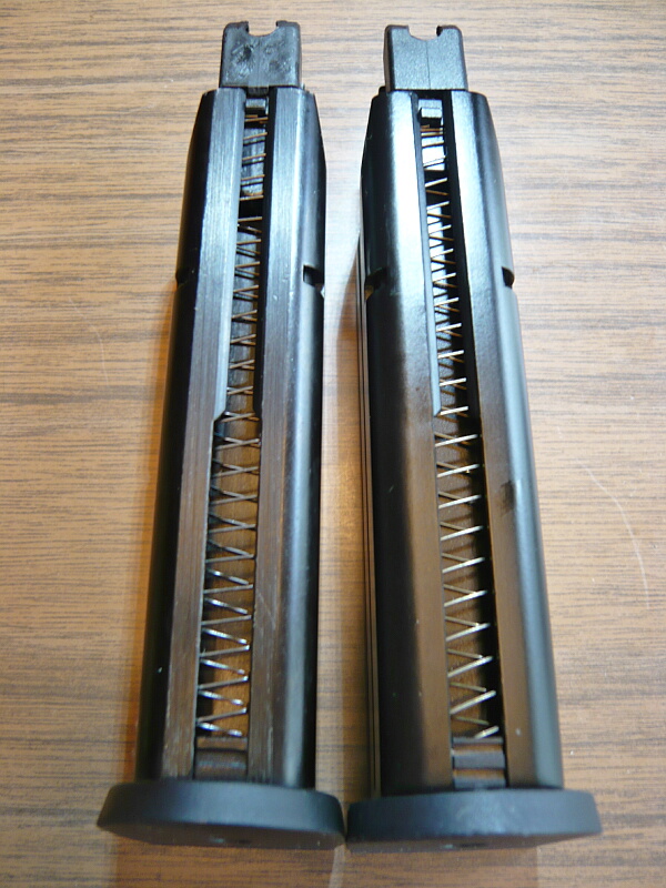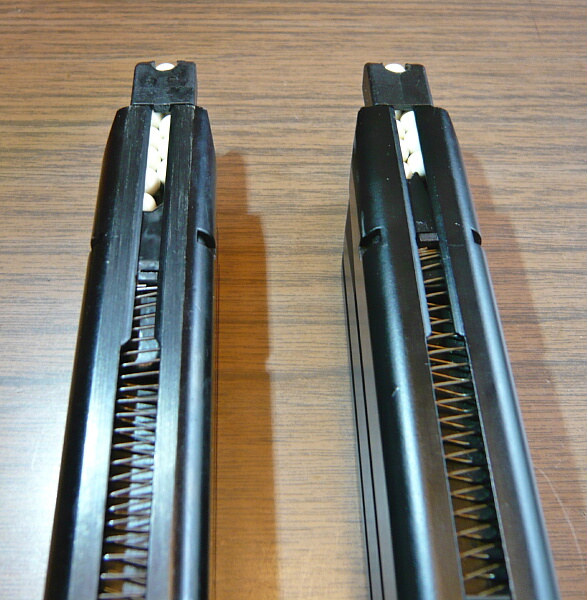 前面。マガジンフォロワーの長さがマルイの方が少し長いので装弾数が少ない?かと思ったらマルイは25発、WEは25発だとギチギチすぎるので実用は24発。