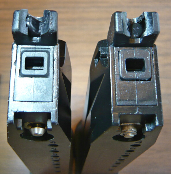 上面。マガジンフォロワーの先端形状やガスルートパッキンの形状に微妙な差異がみられます。