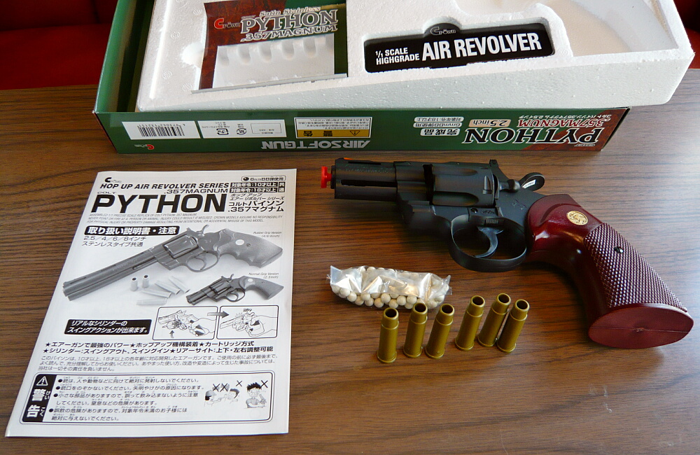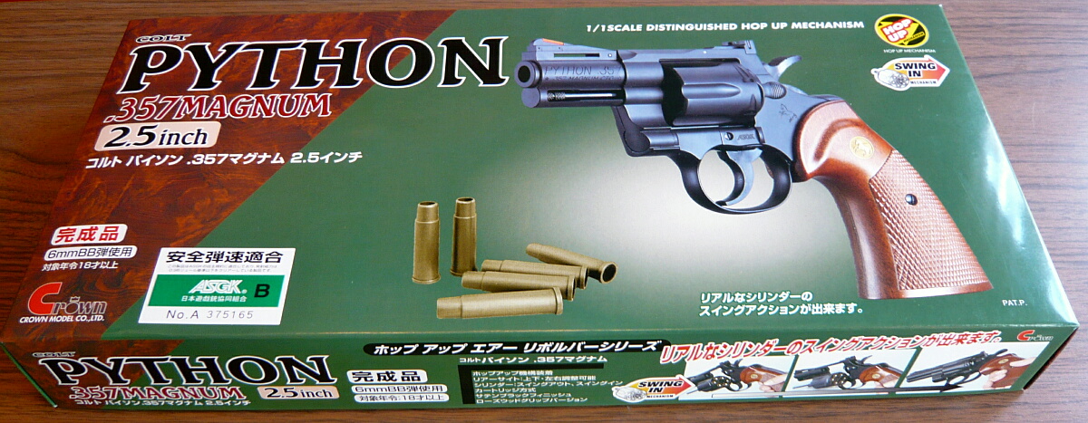 パイソンは正直もうさんざ買ったのでもういいかな…と思っていたのですが、M19の時に間違ってパイソン用の金属カートを買ってしまったので「じゃあ買うか…」という感じ。いやパイソン好きですけども。マルイのエアリボ持ってるし。じゃあ10禁じゃなく18歳以上用で、短いやつにしようと2.5インチ。