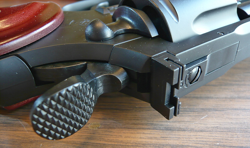 ハンマーのコッキングが凄まじく重いため、シアーに掛かる力も余程とみえてトリガープルも重め。2mmほど樹脂製ゆえのグニャッとしたたわみの後でバツッと切れるトリガープル。買って初回の空撃ちの衝撃でハンマー裏に貼られていたシールが剥がれました。ここに貼っておくとどうしてもハンマースパーがたわんで剥がれる方向に変形するので素直に剥がしてしまうか、グリップ底あたりにでも貼り直しておくとよいでしょう。