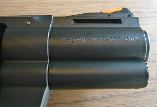 バレル右にはCROWN AIR SOFT GUNとあります。刻印は掘った溝の両脇の盛り上がりがわざとらしい感じではありますが、ただ掘ってあるだけよりはまあ、雰囲気かな…(刻印の掘り具合はマルシンのが好き)