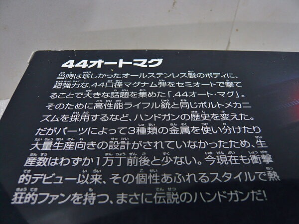 箱裏面。取っておきたくなる箱って素敵。箱裏面のオートマグは実銃の写真なので中身のブツのレベル的にちょっと酷かもしれません・・・