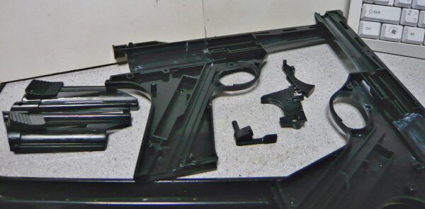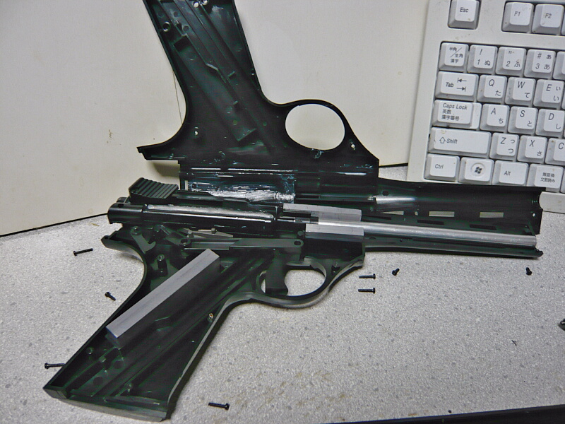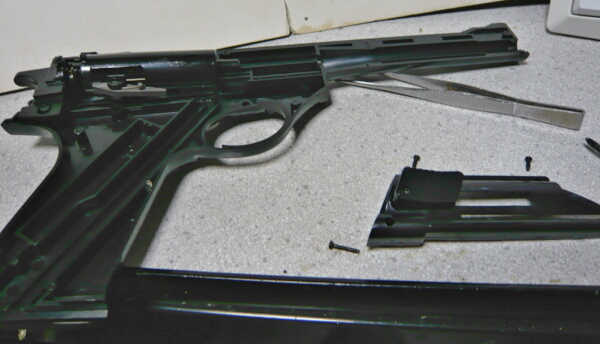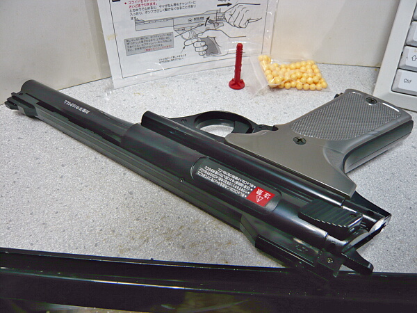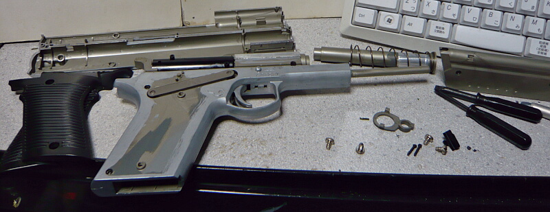 まずは分解。といっても全バラにする必要はないのでグリップパネルを外し、スライドを左右に分け、バレルを外します。