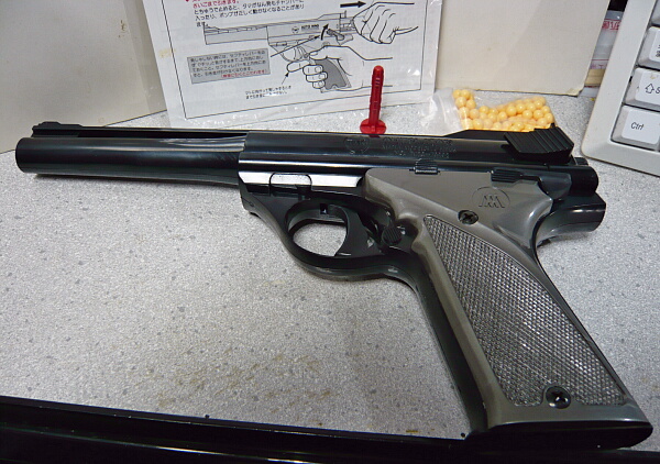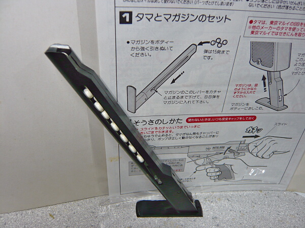 マガジン左側面にあるフォロワーを一番下まで下げるとカチッとロックされるので上から弾を流し込みます。装弾数15発。プラモと同じで古くからあるプラスチック製品は金型のチリが合わなくなってきてバリが多めになるものですが、このマガジンもややバリが立っていてリップ付近に弾の通りが悪い位置があります。しかも左右モナカを接着剤で貼りあわせているので分解不可能ときた・・・