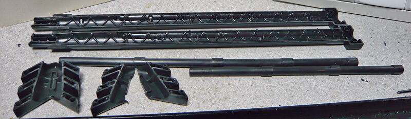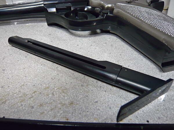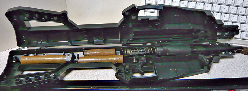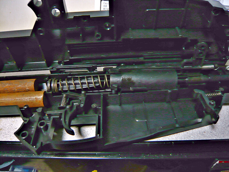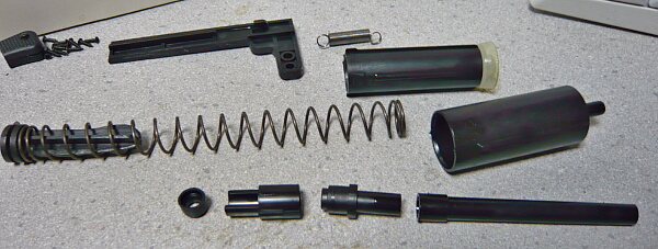 発射に関わる基幹パーツ。シリンダー容量は銃の大きさほどには大きくなく、バネレートで初速を稼いでいる印象。電動ガン用のスプリングより僅かに径の広いスプリングなので流用は出来なさそう。レートもMS90なんかよりずっと強烈に強いものです。チャンバーにはホップアップ機構はなく、インナーバレルはプラ製の同形状のものが銃口までに8本繋ぎ合わせてある強引な作り。もしも銃口までの長さのある一本モノのインナーバレルを用意するとしたら、600mmくらい必要です。シリンダー容量を考えるとその半分もあれば十分ですが、アウターバレルにも魔物が潜んでいます・・・(後述)