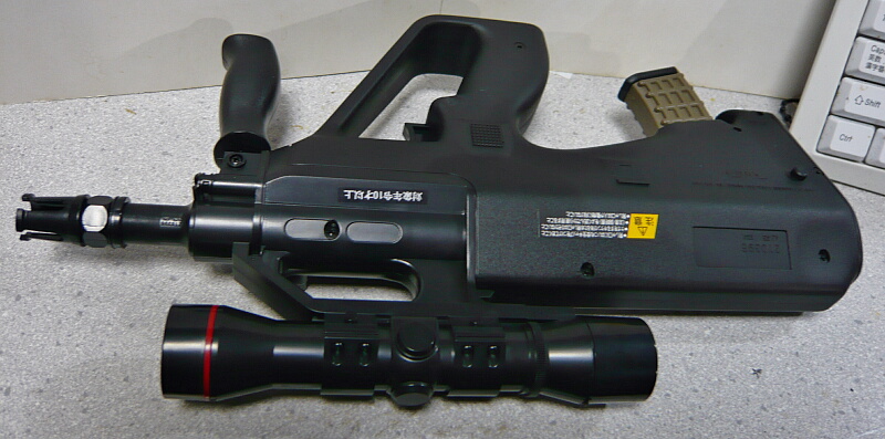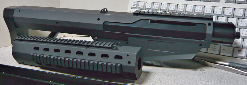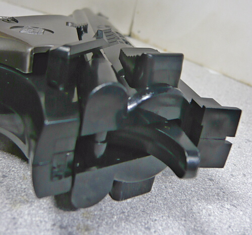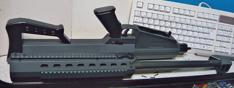 大まかな形状は元のステアーAUGをグリップ周りだけ縮小率を変えて縮めたような形。トリガーガードがグリップ下とつながる特徴的な形状でこのためグリップは窮屈ですが、何とかガード内に指を4本とも入れられる程度。指が太い人は入らないかもしれませんが、その時小指だけを外に出すよりはガードごと握って人差し指だけトリガーに掛ける方がマシかも。