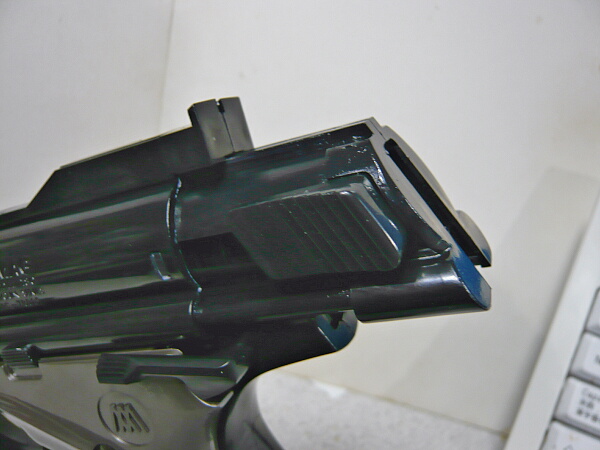 銃尾部分。ゴチャゴチャしていますがこのうち可動するのはグリップ側の左側面にあるセーフティレバーと、ハンマーの左右を囲むように付いているコッキングピースのみ。セーフティレバーは比較的操作性が良く、上画像のように上げた状態がセーフティON、下げて解除でM1911A1などと同じですがハンマーが非可動なのでいつでも操作できます。セーフティONでトリガーがロックされます。トリガーはプラ製の昔ながらのグニャグニャトリガーなのでロックされた状態で無理に引くと千切れる事があるので注意。いや千切った事無いですけども。
