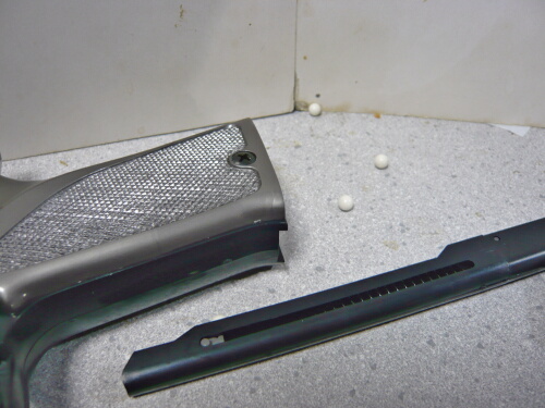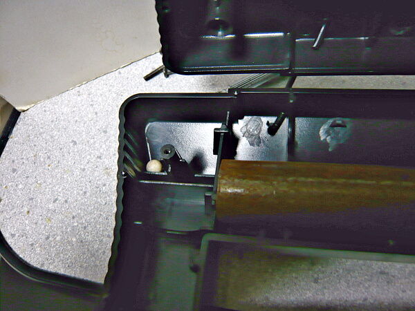 買った当初からストック内でチャリチャリ言っていた原因。BB弾が1個入り込んでいました。マガジンに残弾がある状態でマガジンを抜くとマガジンポートの前側、マガジンキャッチが収まっているあたりが小部屋になっていてここに弾が噴出す事があるので、このあたりからコッキングレバーの上を通って後ろへ流れ込んだものと推測されます。