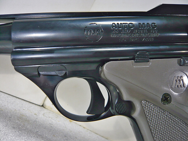 色はツヤのあるABS地肌の黒。グリップパネルはガンメタリックの成型色。全体的にツヤテカしておりこれが安っぽいと云われた所以でもありますが、上写真のようなアングルから見るとイメージとしてはS&W M29のようなマグナムリボルバーと似た雰囲気もあるので黒ならば同様にツヤテカしてた方が断然似合います。本来オートマグには売りであるステンレス色(微妙に茶色味掛かった銀色)のみで黒いモデルは無いのですが、これはこれで・・・