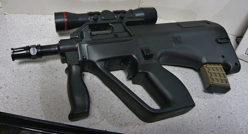 ステアーAUGの中でも固定の1.5倍スコープを持つA1ではなく、標準スコープをなくして代わりにレイルになっているA2がモデル。レイルにマウントリングを介してスコープを載せた姿になっていますが、このトイガンではスコープ内が弾倉になっているので銃本体と一体化しています。スコープの対物側外面の赤やマガジンの茶色が全体のアクセントになっています。マガジンはダミーであり外れません。