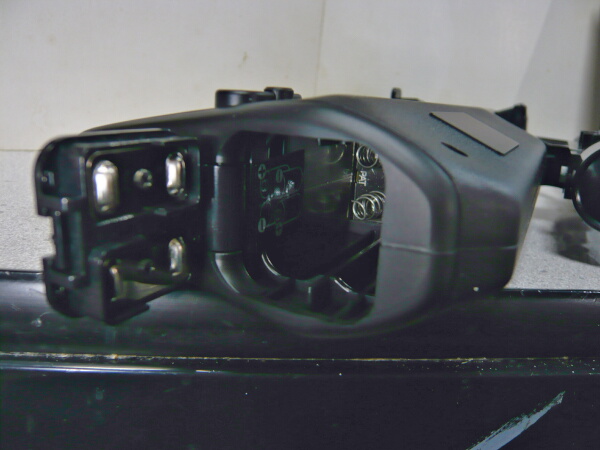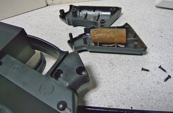 グリップ側面に見えるネジ3本を抜き、隙間に精密ドライバーのマイナスを差し込んでコリコリ拡げて左右に分けて外します。中には錆鉄棒。グリップ基部はもうちょっと気の利いた形だとフルサイズM4グリップをつけるとか出来たのですが、ちょっと面倒な形。不可能では無いのですが・・・