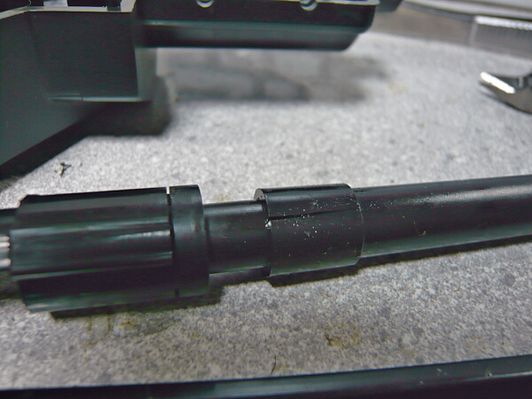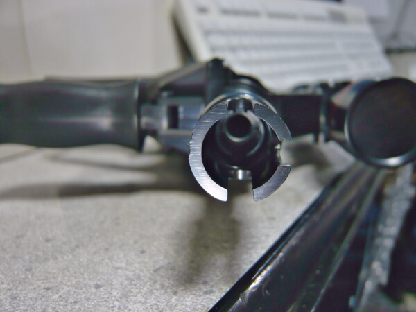ていうかインナーバレル付け根が割れてるじゃねえか!拡げる方へテンションが掛かる部分に浸透潤滑剤の類が入ると微細なヒビに潤滑剤が入り込んでヒビを拡げてしまうので、本来油分はノーサンキューですがこの銃はややチャンバー付近に油分が染みています。ベトベトというほどでは無いのですが、ベトベトでも平気な構造もあればちょっとでも染みていると困る構造もあります。この銃は残念ながら後者。チャンバー直後のパーツにインナーバレル後端を差し込む構造が気密をとるためにややキツめになっているためです。