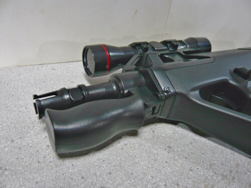 バレル下のフォアグリップは可動しますが、ロックはされないので親指が挟まって窮屈だと思ったら少し前に傾けて保持しても良し。ただしくれぐれも銃口前に手をやらないように注意しましょう。