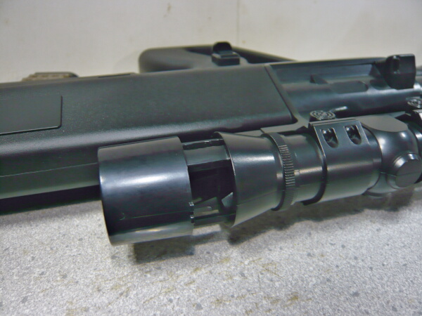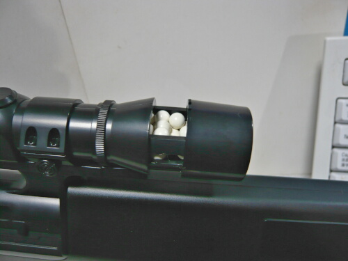 スコープの接眼側を後ろ側へ引っ張ると開口するのでここへBB弾を流し込みます。