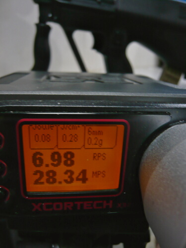 付属の0.12gBB弾では40mps前後と大幅に初速アップしますが、外で撃ってみると10mほど先から猛烈に上へ曲がる弾道を示します。ホップアップの仕様が18歳以上用と同じままスプリング交換だけで初速を落としているのかもしれません・・・付属のBB弾だと5m以内の部屋撃ちくらいにしか使えないので注意が必要です。