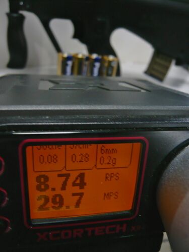 次に電池をアルカリ単三乾電池に換えて計測。電池はUZIミニに入れっぱなしだったものなので新品ではない上にやや消耗していますがそれでも充電池よりは明らかにハイサイクル。8.74rps(一分間に500発ちょい)と出ました。