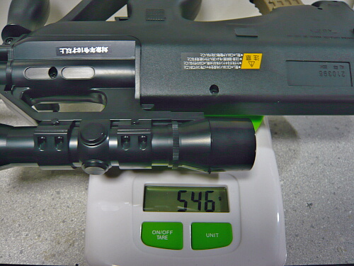 電池4本と弾満載状態で546g。重量バランスはかなり後ろ寄りなので持ってみると独特な感じ。