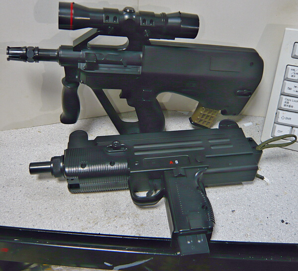 先に買ったUZIミニと。折りたたみストックが邪魔なので外して代わりにパラコードを通しています。計測上は今回のステアーミニの方がUZIミニより初速もサイクルも上回りましたが、個体差どころじゃない差なので実性能差なのでしょう。装弾数も大幅に多いです。勝っているところはどこだ、ディフォルメ少な目な格好かな?