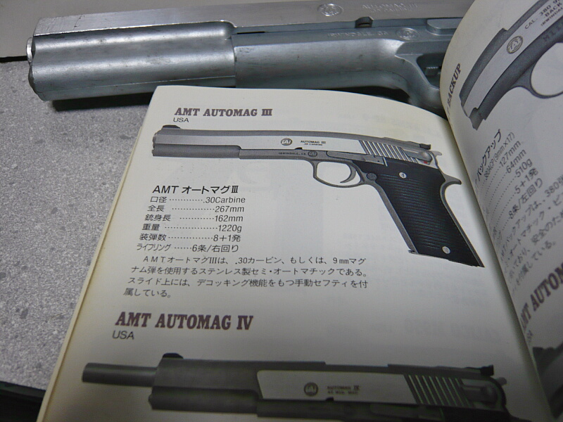 この本は20年ほど前から大事に・・・大分黄ばんでヤレてますが、持っている「最新ピストル図鑑(著:床井雅美)」の中の1ページ。このスライド側面がポリッシュでそれ以外がザラザラしているツートーンの表面仕上げ。