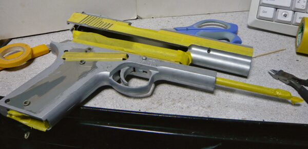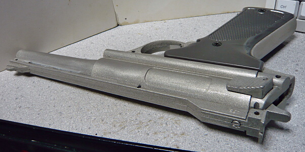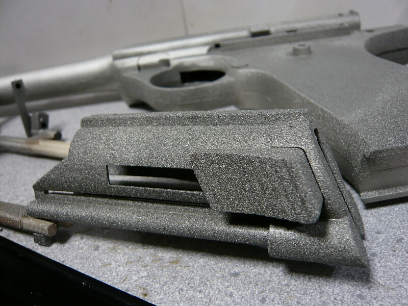 すでに90年代中頃の時点で塗装とアルミテープによっておおよその色とスライド側面のポリッシュ部分は雰囲気だけそれっぽくしてあります。しかしシボ加工というのはそもそもサンドブラストや化学処理によって掛けられるもので素人がお手軽に出来るわけもなく・・・