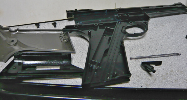 左グリップパネルは上側のボルトストップのモールドに引っかかっているので下側を開きつつ前へスライドさせて抜き、その下になっているリコイルスプリングとセーフティレバーを外します。最後に残ったボルト左側を後ろへスライドさせてから斜めに抜くようにして取り外します。一部知恵の輪のように面倒な部分がありますがブチ折ったりしないよう丁寧に。